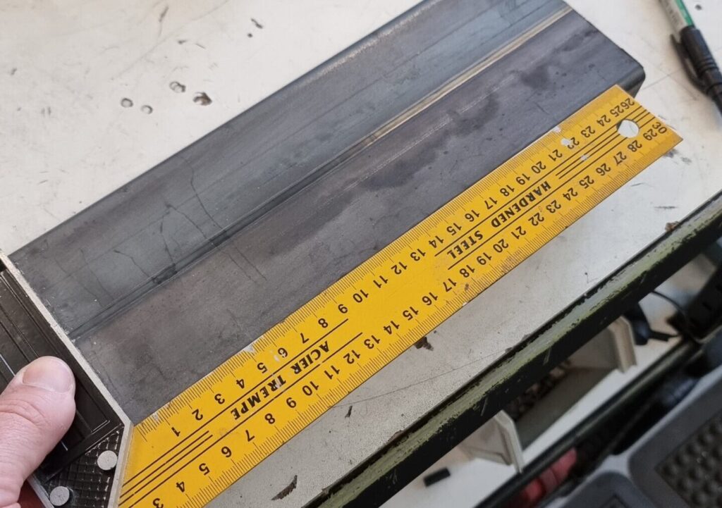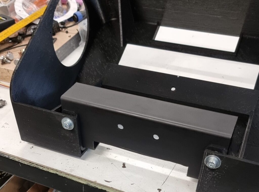 We use a metal profile for the bracket. First, we measure and mark the cutting lines and drill hole positions. After cutting, sanding, and painting, we have a sturdy support that will hold the dashboard even during intense simulator use.